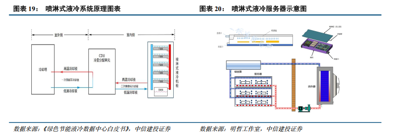 喷淋式液冷:直接接触式液冷,面向芯片级器件精准喷淋,通过重力或系统压力直接将冷却液喷洒至发热器件或与之连接的导热元件上的液冷形式。散热效果:喷淋式液冷也可完全去除散热风扇(实现100%液体冷却),换热能力强,相较于浸没式液冷节省冷却液,数据中心PUE可降至1.1左右。喷淋式液冷需要对机柜和服务器机箱进行改造,运维难度较大,节能效果差于浸没式液冷。