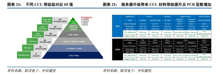服务器平台持续升级带来CCL材料等级提升及PCB层数增加。根据Prismark数据,PCIe3.0总线标准下,信号传输速率为8Gbps,服务器主板PCB为8-12层,相对应的CCL材料Df值在0.014-0.02之间,属于中损耗等级;PCIe4.0总线16Gbps的传输速率,PCB层数需要提高到12-16层,CCL材料Df值在0.008-0.014之间,属于低损耗等级;当总线标准提升至PCIe5.0,数据传输速率达到36Gbps,PCB层数需要达到16层以上,CCL材料Df值降至0.004-0.008区间,属于超低损耗材等级。2024年BrichStream平台开始逐渐渗透,尽管PCIe标准认为5.0(AMD平台对应Zen5),但CCL材料等级已经逐渐向UltraLowLoss升级,PCB板层数提升至18-22层。