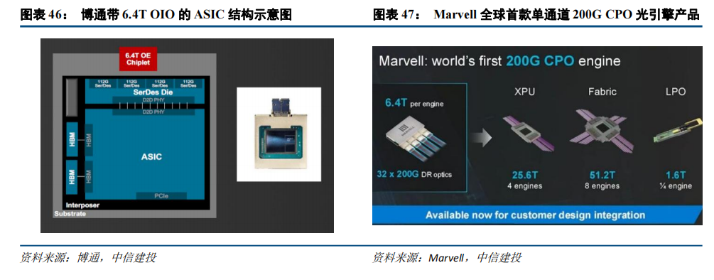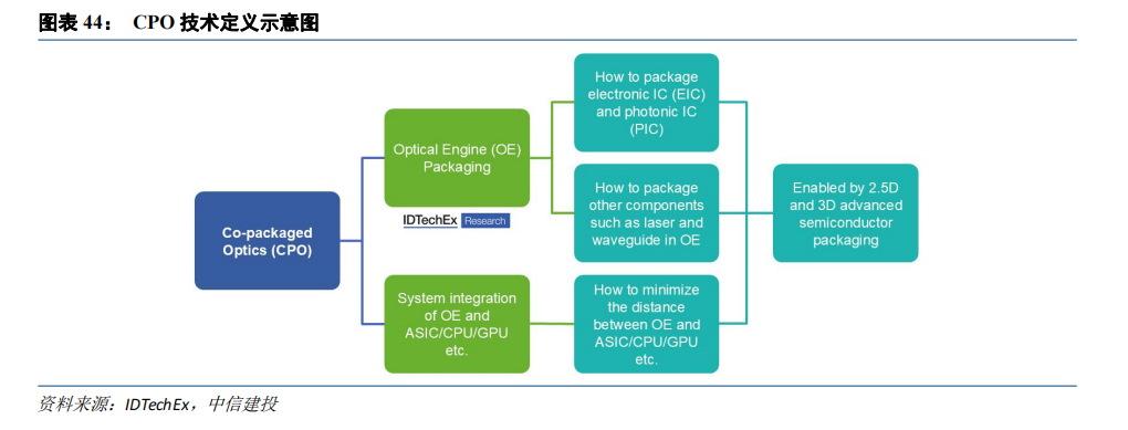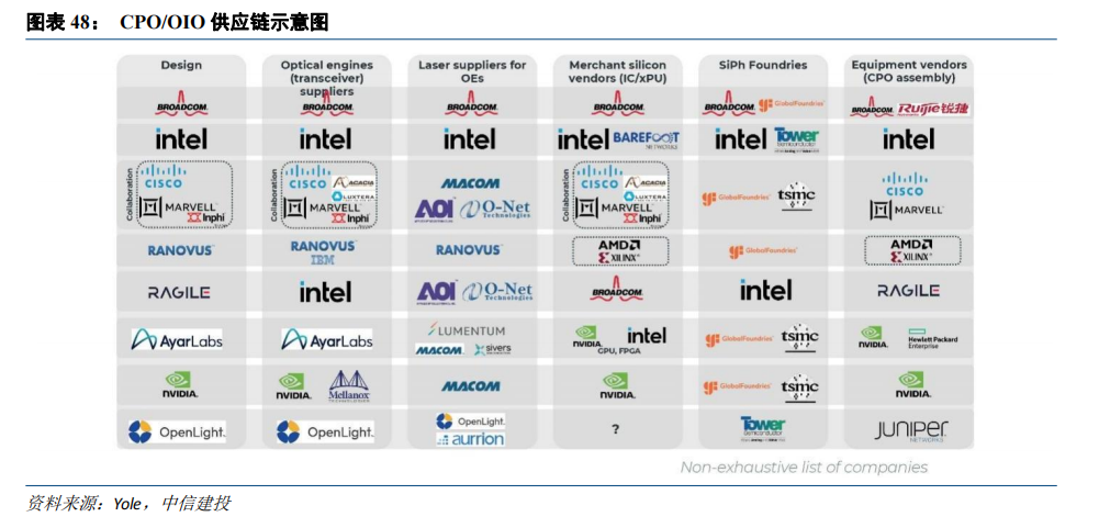 5)光模块:除了GPU等算力硬件需求强劲,也催生了网络端更大带宽需求。优秀的网络性能可以提升计算效率,显著提升算力水平。相较于传统的云计算网络,AI训练组网由叶脊架构向胖树架构转变,交换机和光模块数量大幅提升,且随着通信数据量的增加,对光模块的速率要求也更高。800G光模块2023年开始放量,2024-2026年都保持高速增长;1.6T光模块2025年开始出货,2026年有望放量,整个光模块产业链迎来量价齐升的景气周期。从竞争格局看,国内光模块巨头经历了一轮又一轮的竞争,与北美的云厂商深度绑定,占据了全球光模块市场的主要份额。从未来技术趋势演进看,我们建议关注硅光与CPO(共封装光学)。