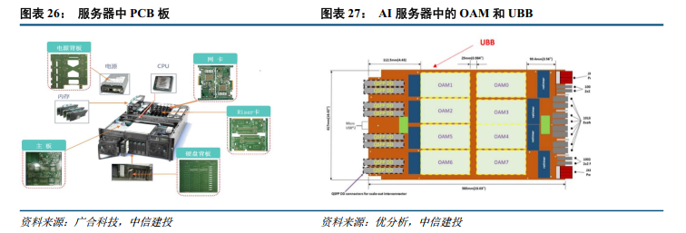 (1)新增UBB母板。AI服务器最大的差异在于在传统CPU的基础上增加GPU模块来支持计算功能,因此从过往的1块主板(CPU母板)为主变为2块主板(CPU母和GPU母版)。UBB主板是搭载GPU加速卡的平台,与GPU加速模块(SXM/OAM模块)直接相连,为GPU加速模块提供高效的数据传输与交换通道,同时具备一定的数据管理功能,通常具有高性能、高稳定性和高可拓展型等特点。