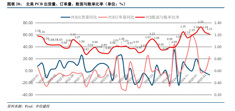 北美PCB账面与账单比率连续8个季度维持在1以上。账面与账单比率是通过将过去三个月预订的订单价值除以调查样本中同期公司的销售额计算得到的,账面与账单比率超过1.00的比率表明当前的需求领先于供应,这是未来三到十二个月销售增长的积极指标, 2024年9月至2025年4月,北美PCB在账面与账单比例分别为1.08、1.25、1.15、1.19、1.24、1.33、1.24、1.21,目前已连续8个月维持正在1以上。