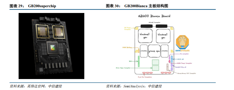 GB200 PCB设计材料全面升级。GB200 NVL72核心是采用superchip设计的Bianca主板,一个系统内共18个computetray、9个switchtray和36个superchip。单个computetray内有两个superchip,每片superchip有1颗CPU和2颗GPU,取消了UBB板和单独的CPU主板。相比H100,NVL72的CPU和GPU都在同一块superchip板上,因此不再需要用以承载单颗GPU的OAM加速卡和CPU主板。Switchtray承担GPU的互联功能,因此不再需要UBB板。即NVL72取消原来的UBB,使用Switchtray进行GPU互联。