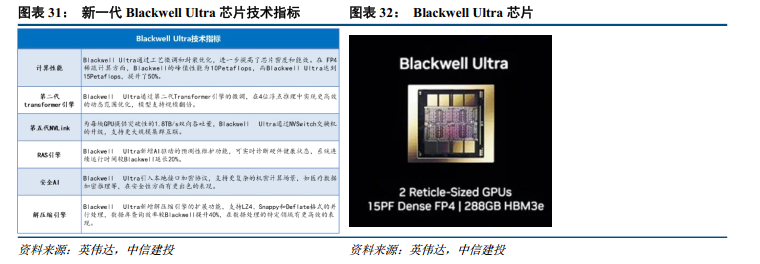 Blackwell Ultra(B300)芯片算力性能再度升级。GTC2025上,基于Blackwell架构的新一代AI计算平台Blackwell Ultra(B300)正式发布,专为大规模推理和复杂任务设计,针对实时推理和Agentic AI进行专门优。核心规格方面,Blackwell Ultra(B300)首次采用HBM3e-12Hi内存堆栈(B200为8Hi),单芯片显存提升为288GB。基于台积电4nm工艺集成2080亿晶体管,单卡功耗达1.4kW,支持液冷设计。采用NVLink5.0技术,实现1.8TB/s GPU间互联带宽。算力性能方面,Blackwell Ultra搭载新一代Blackwell Tensor Core,FP4算力较前代B200提升50%,达15PetaFLOPS,针对推理场景有特别优化。并在芯片架构、通信速度、能效表现、安全性等方面有更出色的表现。