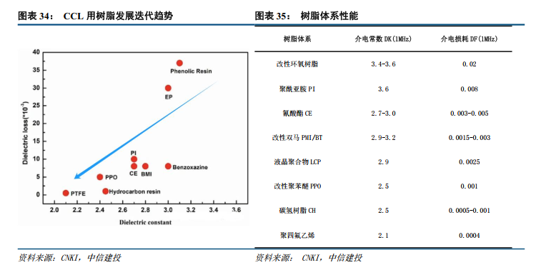 高速覆铜板对电性能要求更严苛,PPO、碳氢等树脂材料受到关注。随着AI服务器、CPU服务器PCIe、交换机、光模块持续升级,对上游CCL及其树脂材料要求也相应升级。从介电损耗指标出发:在M6、M7、M7N级CCL领域,PPO、PI等树脂、改性BMI的值满足要求;在M8级CCL领域,PPO等树脂的值满足要求;在M9级及以上CCL领域,值要求在0.001以内,树脂材料或向碳氢、PTFE体系迭代。但另一方面,碳氢树脂、PTFE树脂面临粘结性差、加工难度大等问题,运用在覆铜板领域有局限性,有待工艺进一步优化。