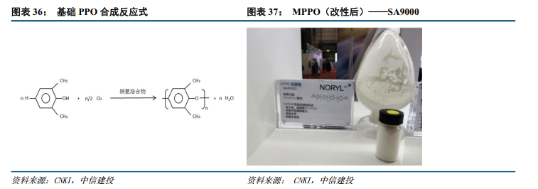 PPO电化学性能优异,改性后成为高速CCL理想材料。聚苯醚简称PPO,是一种耐高温的热塑性树脂;由2,6-二甲基苯酚聚合得到,相对分子量为2.5~3万,并于1965年实现了工业化生产。改性前的聚苯醚优点是:具备突出的耐热、力学性能、电气绝缘性能等。缺点是熔融温度高,熔融粘度大,加工困难,浸透性差,不耐某些有机溶剂,不能满足覆铜板的要求。因此为了将PPO提升加工性等性能以用于覆铜板领域,必须将其改性为热固性树脂。