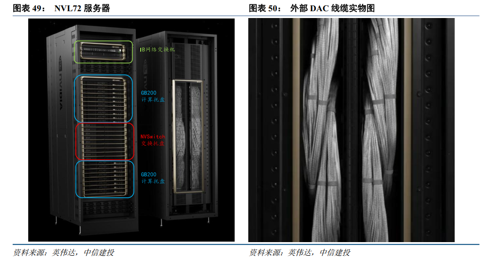 业界主流的超节点方案主要包括私有协议方案和开放组织方案两种,私有协议主要包括英伟达、Trainium方案、华为方案等。在英伟达方案中,GB200NVL72服务器采用大量的铜连接作为机柜内部通讯方式,GB200NVL72机柜中不同的计算托盘间采用电缆进行互联,内部使用电缆长度累计接近2英里,共有5000多条独立电缆。计算托盘内同样采用大量铜连接作为服务器内的GPU芯片互联。GB200NVL72服务器中包含三种铜缆:三种柜内线(NVL72机柜以内的定义为柜内线)以及柜外线(机柜间的互联定义为柜外线)。