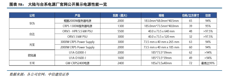 核心看,伴随服务器(尤其是AI服务器)功耗总额的快速提升,在OCP ORV3标准限制下服务器电源必须通过提升功率密度并维持高能源转化率(钛金96%以上)以满足服务器运转需要。更好的材料、更优的拓扑、更多的集成是功率密度提升的主要途径,因此电源行业不仅享受了总功耗提升带来的需求快速上行,同时也因为材料变更、散热需求加强等因素带来了单瓦特价格提升现象,并助力行业空间快速扩容。此外,考虑到近期大陆区域外流片难度加大,伴随大陆区域流片芯片占比增加,电源功耗需求有望呈现进一步提升趋势。