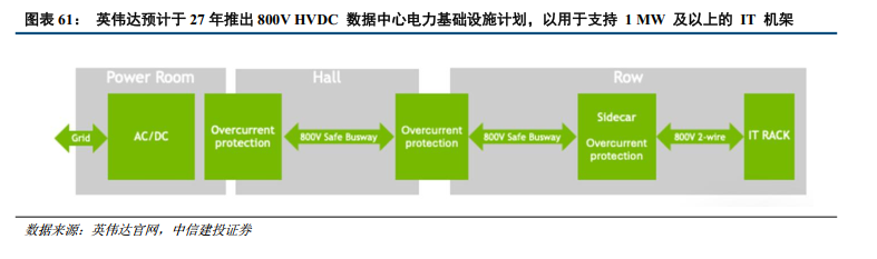 后续伴随海外Rubin架构芯片产品落地,服务器电源功率密度有望再次实现飞跃。近期,英伟达联合其他电器设备供应商,发布预定2027 年落地的800 V HVDC 数据中心电力基础设施计划,以用于支持 1 MW 及以上的 IT 机架。考虑到当前机柜式服务器中电源的溢价主要来自于空间的紧缺以及散热能力的提升,远期1MW机柜必将衍生出更高价值量的电源需求。
