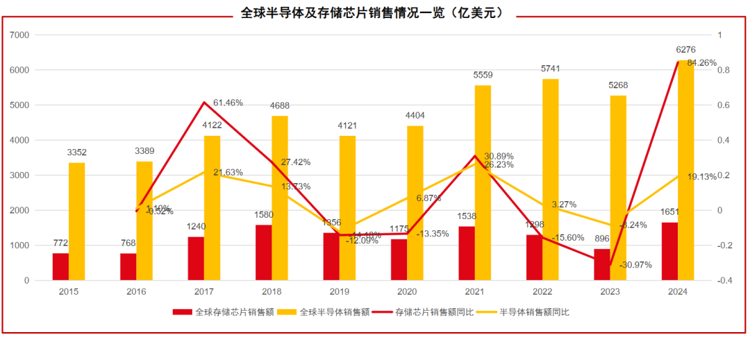 根据SIA发布的数据来看,2024年全球存储芯片销售额达到1651亿美元,同比增长约84%,主要受益于AI服务器、高性能计算、智能终端和汽车电子对高带宽、大容量存储需求的持续增长。WSTS预计2025年全球存储芯片有望增长至接近2,000亿美元。