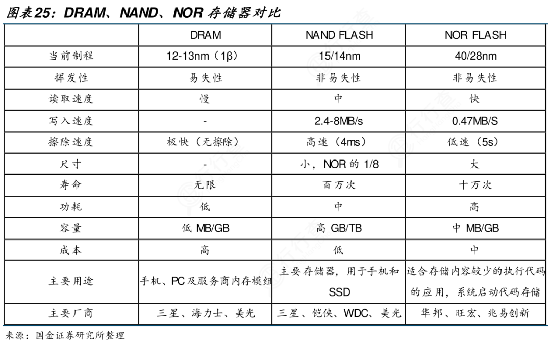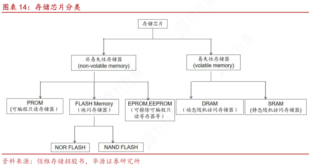 存储芯片分为非易失性存储器与易失性存储器,非易失性存储器包含PROM、快闪存储器(FLASH Memory,又分为 NOR FLASH 和 NAND FLASH)、EPROM、EEPROM等,易失性存储器包含动态随机访问存储器(DRAM)和静态随机访问存储器(SRAM)。