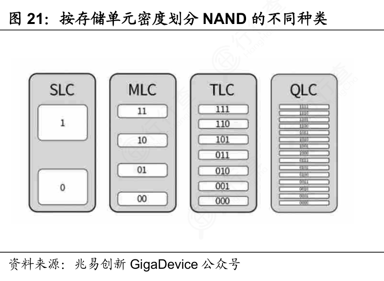 NAND闪存是最主流的非挥发性存储技术,采用电荷捕获原理实现数据存储。NAND闪存根据不同存储单元的密度可以分为SLC、MLC、TLC和QLC四种类型。每种类型的存储单元能够存储的比特数依次增加,从SLC的每个单元存储1比特,到MLC的2比特,再到TLC的3比特,最后到QLC的4比特。随着每个存储单元能存储的比特数增加,整体存储密度提升,单位成本降低。