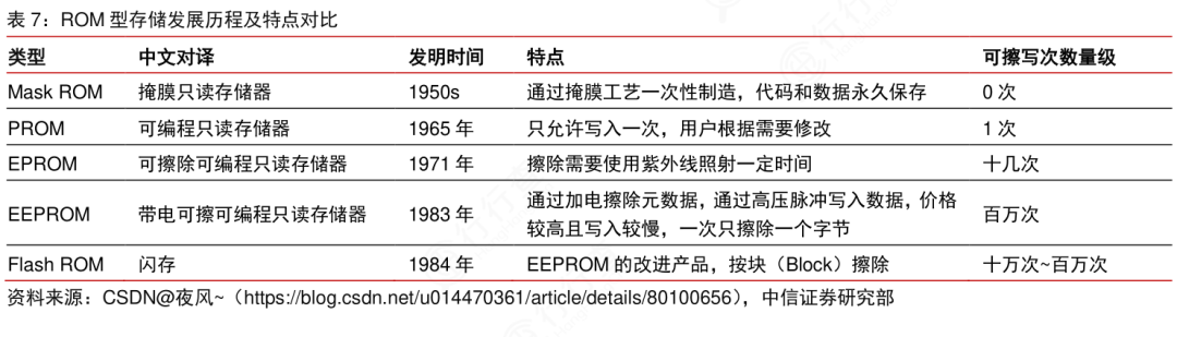 ROM是早期非挥发性存储技术,按可擦写性分为:掩膜ROM(出厂后不可修改)、PROM(一次性编程)、EPROM(紫外擦除)和EEPROM(电擦除)。当前除EEPROM在小型存储场景(如BIOS芯片)仍有应用外,大部分市场已被闪存替代。