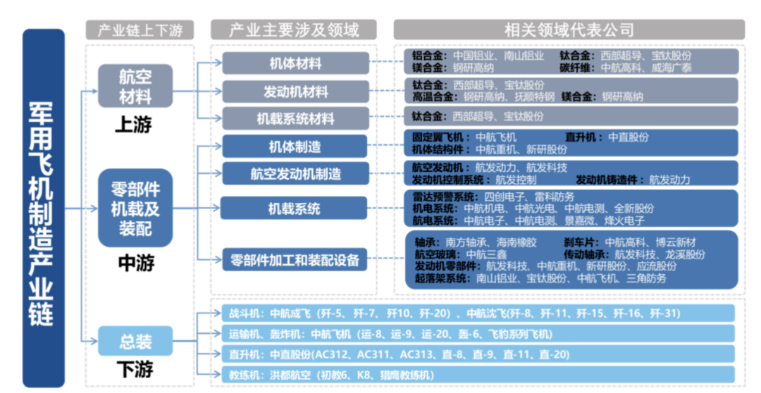 军机制造链上游为材料制造,中游是部件制造,下游为总装集成制造。