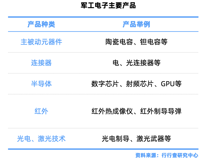 被动元件中军用MLCC(多层陶瓷电容器)占据主导;主动元件集成电路(如军用CPU、FPGA、DSP、GPU)实现自主可控。其它涉及钽电容、连接器、存储器、射频、信号链和电源管理等多个细分领域。
