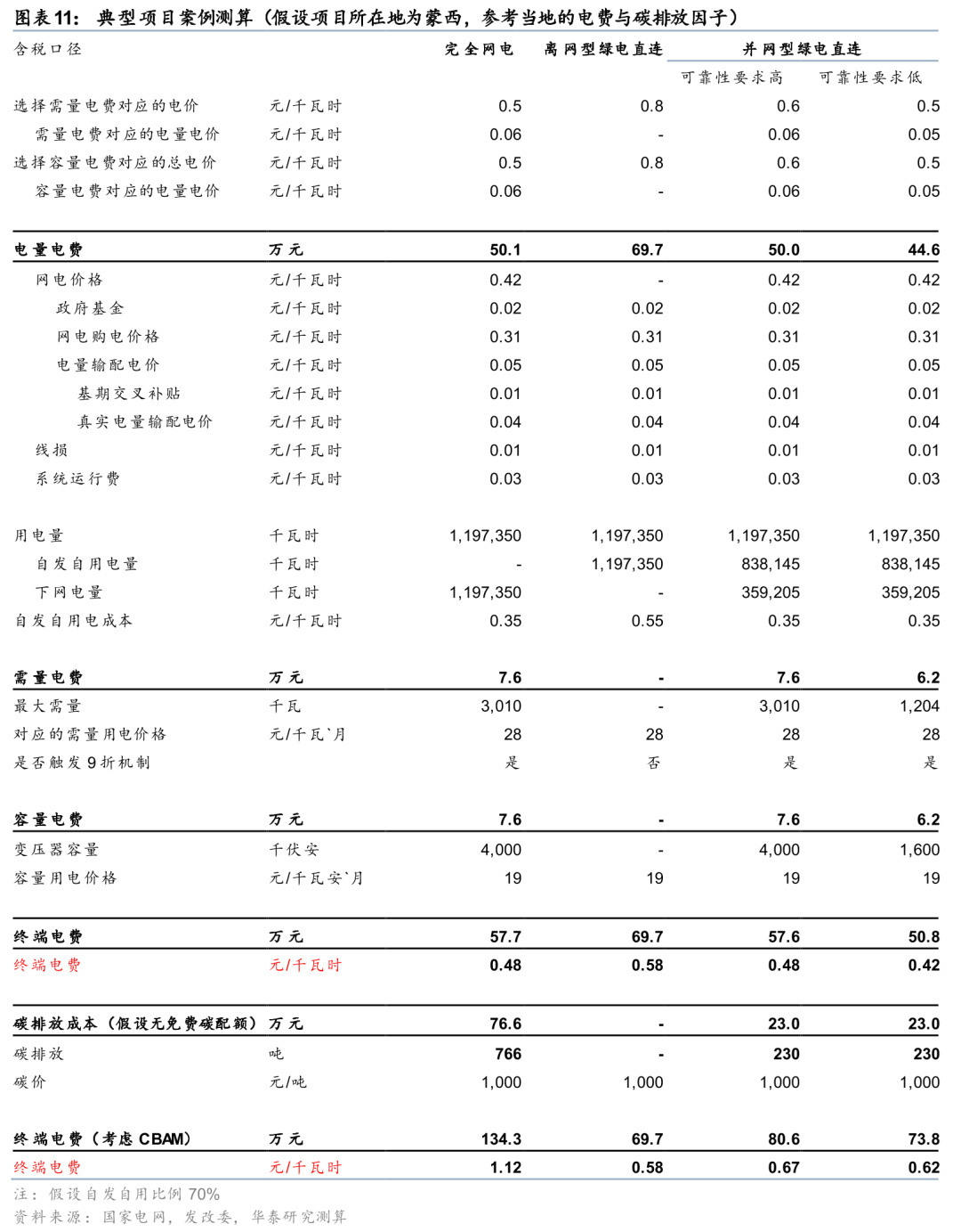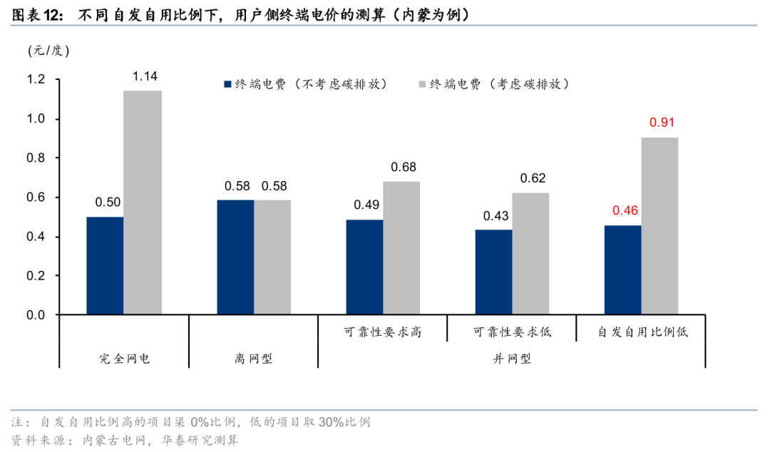 2) 对于并网型项目来说(假设自发自用比例达70%),不考虑CBAM的情况下电价可以节省0.04-0.06元/度(其中自发自用电量免缴线损和系统运行费分别贡献1分和3分);考虑碳排成本,整体的电费节约可达0.45元/度。倘若配置的可再生能源中包括风电、水电和生物质,能源成本的节约大概率会进一步提升。