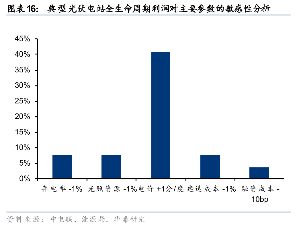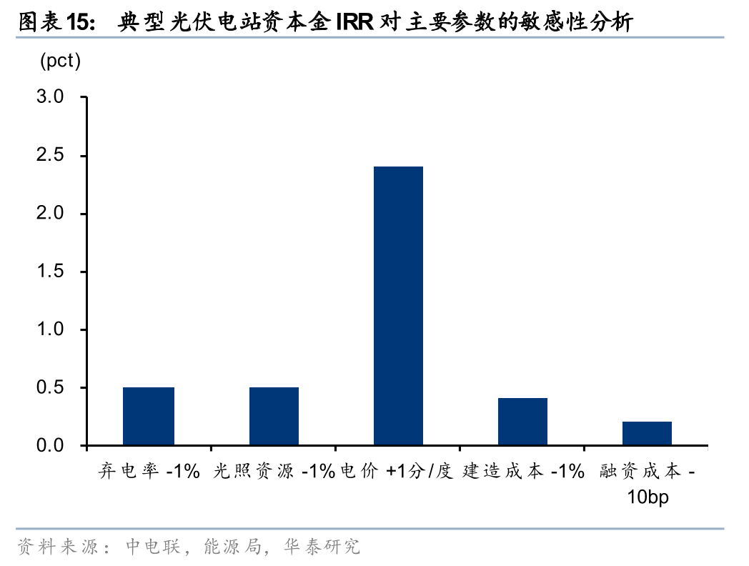 事实上,优质负荷相比风光资源更为稀缺,我们并不认为绿电直连项目的0.04-0.15元/度的电费节省会主要体现在发电公司的盈利上。但是,与大用户长期合作、直连供电确实可以切实降低风光电站的弃电率,尤其在消纳压力较大的三北地区。根据我们测算,对一个资本金IRR仅6%的光伏电站(全投资3%-4%),若电价有0.01元/度的增厚,项目的盈利弹性已经高达40%左右了。