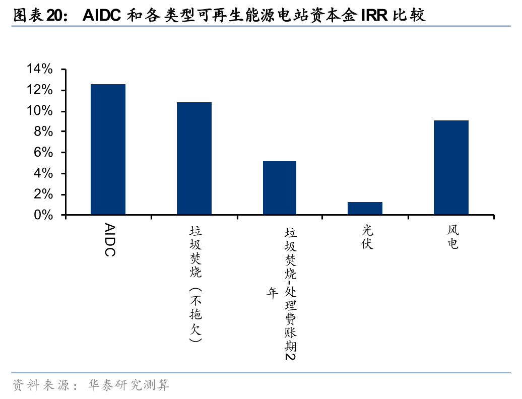 2) 目前单体AIDC的回报率显著高于单体平价的风电和光伏,与垃圾焚烧资产(不考虑政府欠费)相差不大,但是显著高于国补和垃圾处理费拖欠的垃圾焚烧项目(假设回款率50%),所以从可再生能源资产衍生向AIDC的投资本身大概率可以增厚IRR。