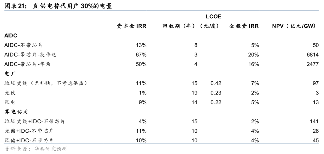 1) 风光不配储(实际概率较低),发电量占用电量的30%:单纯光伏电站延伸参与AIDC投资的收益最大,光伏在内蒙参与交易以2025年的市场化电价几乎在盈亏边缘,直连AIDC后保障消纳盈利能力大幅提升,且考虑输配电费节约后光伏 AIDC单GW的NPV相比单独的光伏和AIDC增厚幅度达6%;风电和垃圾焚烧电厂因为本身盈利能力不差,增厚幅度显著低于光伏。其中,垃圾焚烧直连AIDC相比发电和数据中心的单独投资并未带来价值增厚,因为垃圾焚烧发电上网电价本身就有增值税优惠,直连后反而损失了该部分收益。