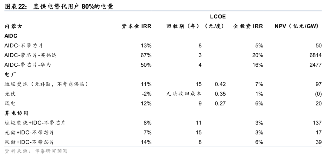 2) 风光配储40%/80%,发电量占用电量的80%:单纯光伏电站延伸参与AIDC投资的收益最大,光伏配储在内蒙参与交易也难以盈利,直连AIDC后保障消纳盈利能力大幅提升,且考虑输配电费节约后光伏 AIDC单GW的NPV相比单独的光伏和AIDC增厚幅度达54%,风电增厚幅度为6%。可见,在风光资源优质的区域,即便是内蒙这样购电价格较低的区域,只要“源”“荷”端适配能力较高,配储以更高比例供电依然大概率是更优的方案。不过实操层面,因为AIDC对供电稳定性要求较高,且可能有当地电价优惠(例如内蒙古的战略新兴行业交易) ,增厚幅度可能远低于我们的测算。