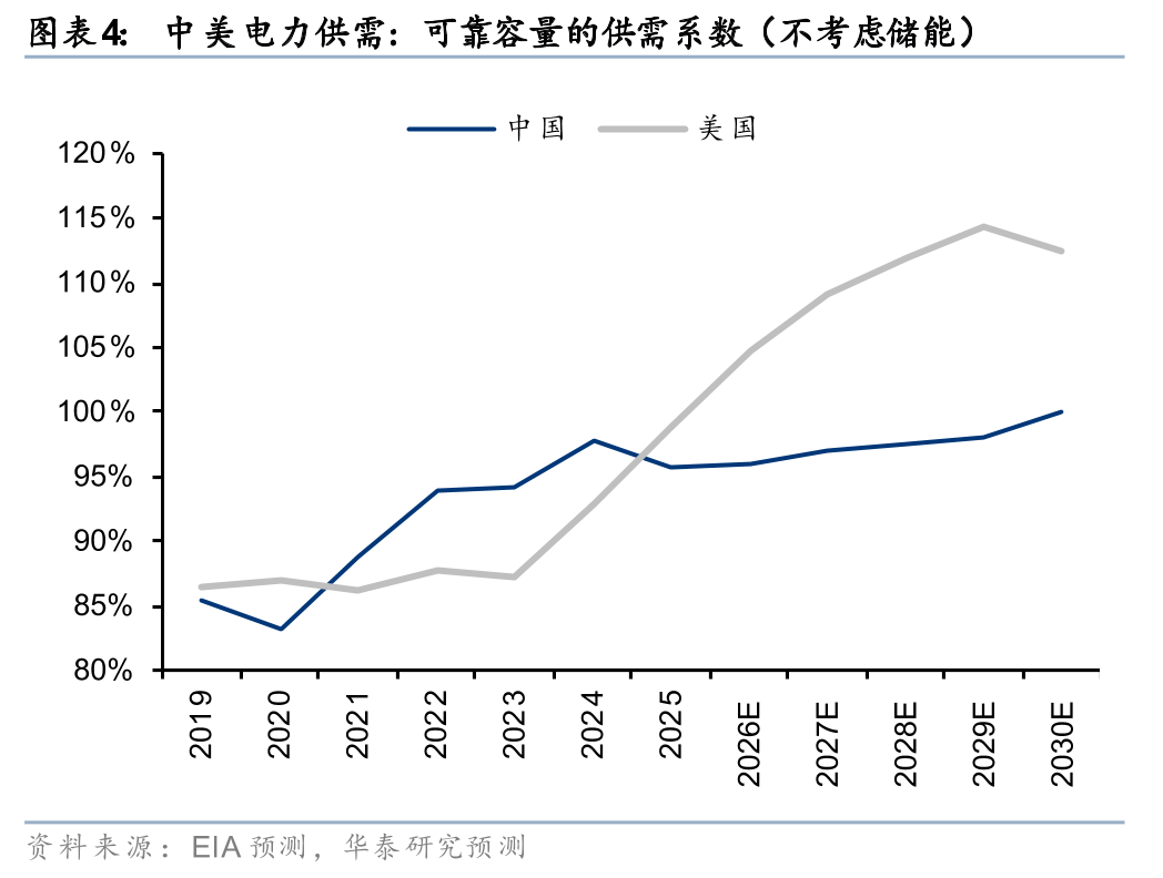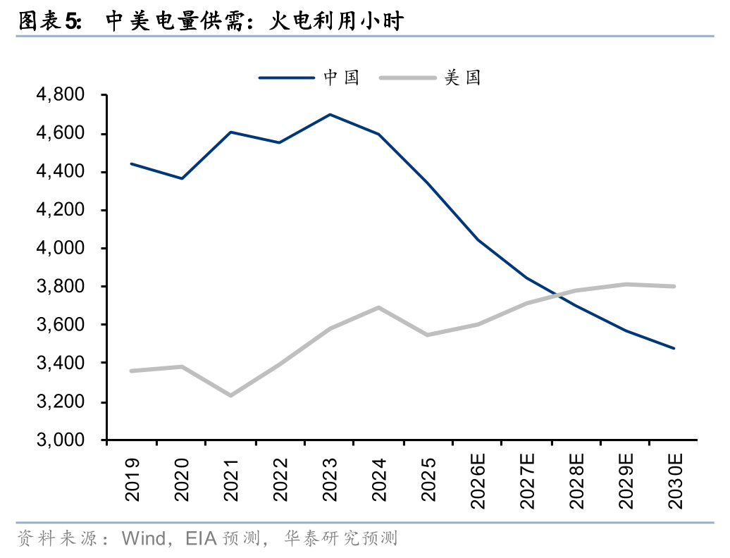 当然我国电力供应不是瓶颈,但是未雨绸缪的布局的确彰显了大国的战略前瞻性。正如我们在2026年3月的报告《公用事业: 量化测算Token出海对中国电力的弹性》中测算的,倘若中国芯片不再是核心制约,Agent时代的token消费量增速大概率会带动中国的容量电价反弹,也就是尖峰负荷供应转为紧张。通过我们2026年1月的报告《公用事业: 中美电价剪刀差:大国的相同与不同》我们也证明了:即使不考虑中国AI需求爆发,相比美国,中国的电量产能利用率(火电的利用小时)2028年之前大概率还是更高的,电力供应也并没有更为宽松多少(2025年美国才超过中国)。