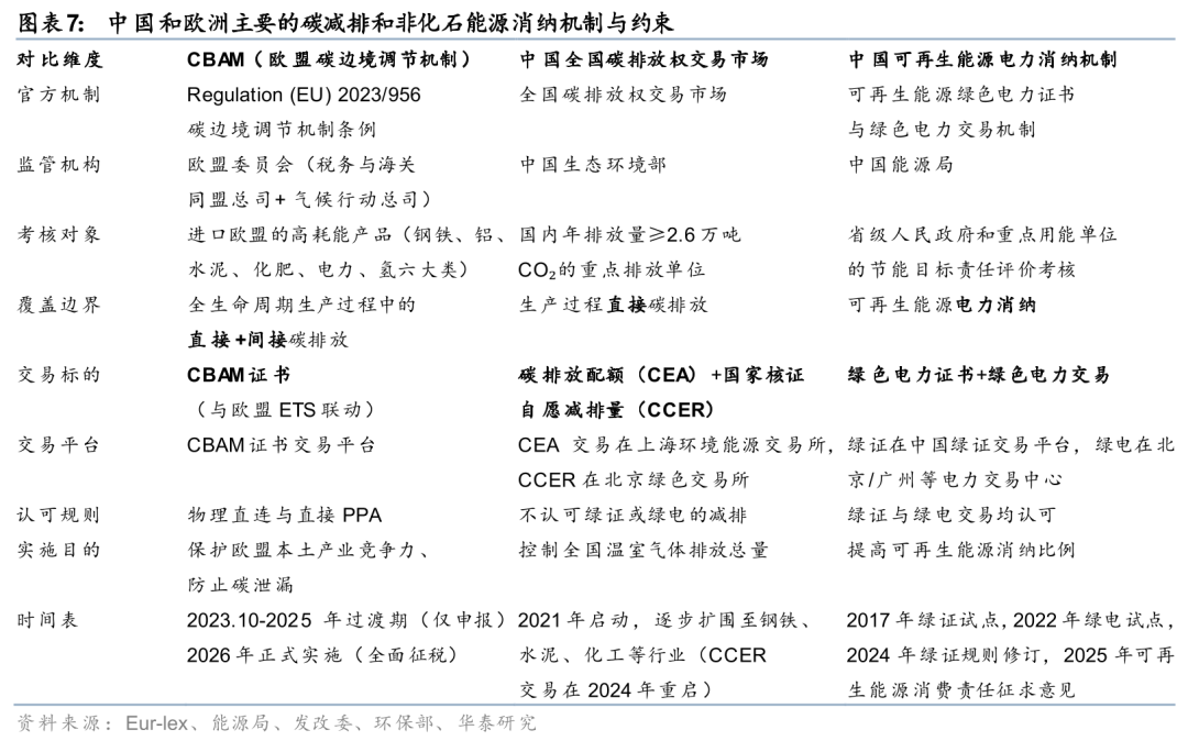 国内减碳机制中,碳市场覆盖高耗能企业的直接碳排放(不包括用电产生的间接碳排放,因为火电早在2021年就被纳入了碳排体系,避免重复计算),排放企业可以通过购买碳配额(CEA)和自愿减排量(CCER)履约。电力领域的可再生能源消纳由能源局考核和组织,交易标的为绿证(包括绿电交易中附带的绿证)。全球层面,从2026年1月开始施行的CBAM对出口欧洲的高耗能产品仅认可绿电物理直连(a direct technical link between the installation in which the imported good is produced and the electricity generation source)与直接绿电交易(a power purchase agreement between the authorised CBAM declarant and a producer of electricity),中国绿证或碳市场的交易标的都不能被用来抵扣CBAM的碳税。