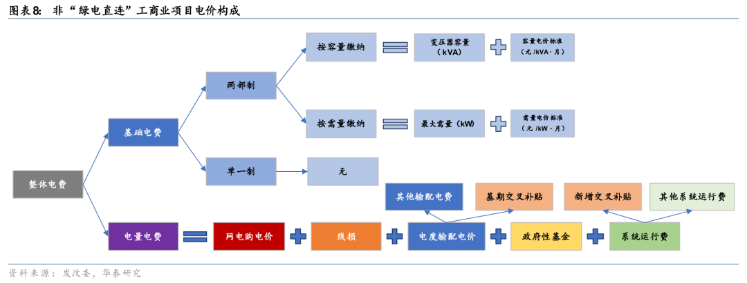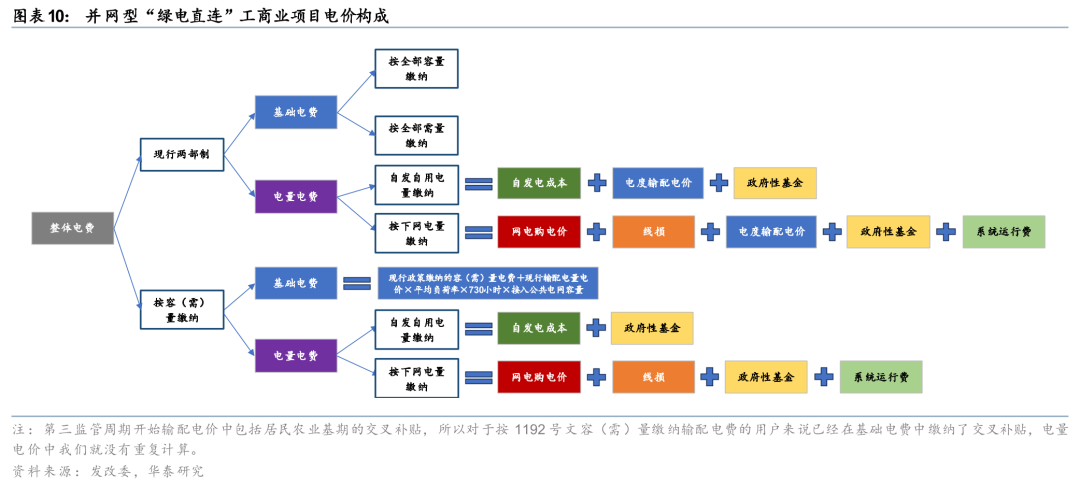 并网型绿电直连更为普遍,计量较为复杂,主要取决于用户的:1)可靠性要求,需要容量备份的项目需要继续按现行两部制输配电价模式缴费,电量电费根据全部用电量缴纳,电费节省相对有限;2)倘若用户可以通过内部电源平衡 储能配套 负荷调节显著降低向公共电网申报的接入容量和需量,可以显著减少基础电费。