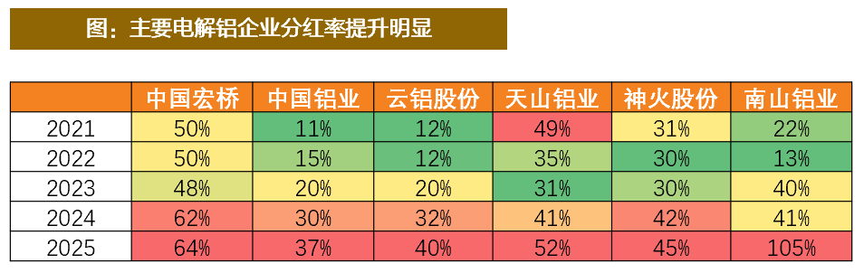 近年来行业提升分红的趋势非常明显。在产能天花板强约束下,行业资本开支收缩,现金流大幅改善,头部铝企提升分红率趋势明显,除了下表中的数据,中孚实业在过去十年未进行分红,25年4月规划未来三年(25-27)分红不少于当年/期末可分配利润的60%;南山铝业25年特别分红近30亿,累计分红高达105%。
