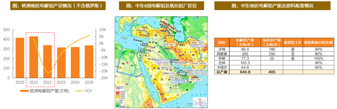 电解铝产能冲击之变:本次美伊冲突影响的产能规模更大。本次美伊冲突对铝产业链的冲击,在绝对量级上远超22年的俄乌,相比22年欧洲百万吨级的“成本驱动型减产”,本次中东面临近600万吨产能的“原料断供型”减产,随着时间推移,我们认为中东供应风险可能在非线性加速累积。