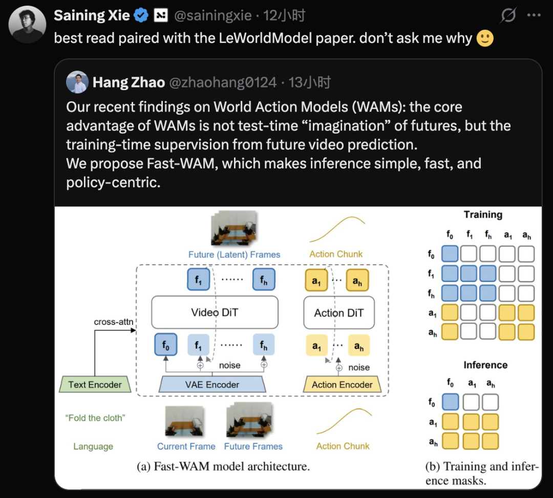 Fast-WAM获得了Yann LeCun的转发、谢赛宁的点赞,谢赛宁还将其与LeCun最新力作LeWorldModel并列推荐。