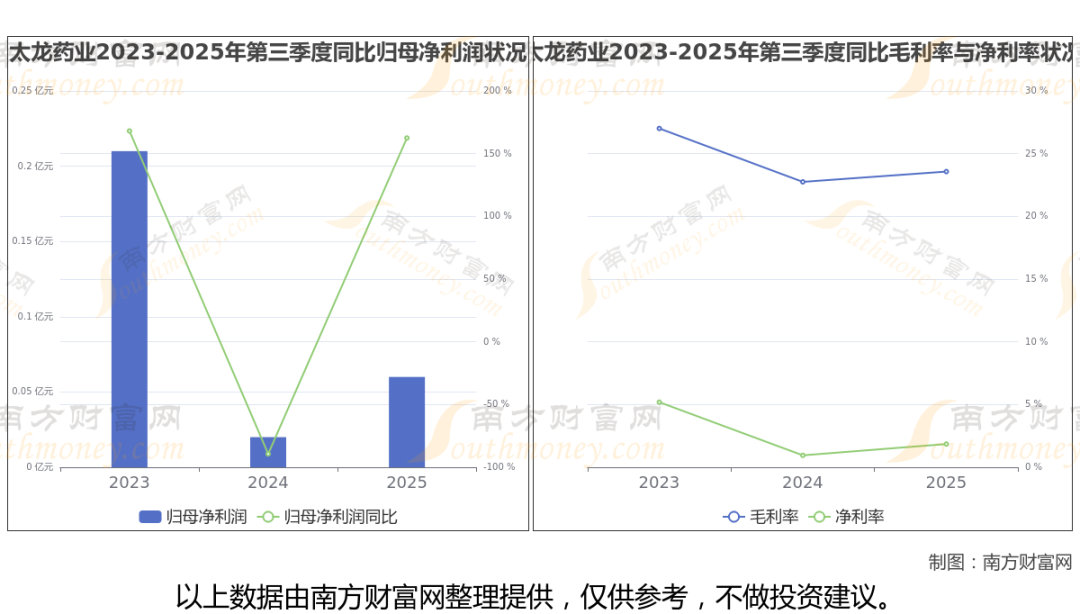 2025年第三季度季报显示,太龙药业公司实现净利润597.89万,同比上年增长率为162.48%,毛利率23.57%,归属净利润597.89万,同比增长162.48%。