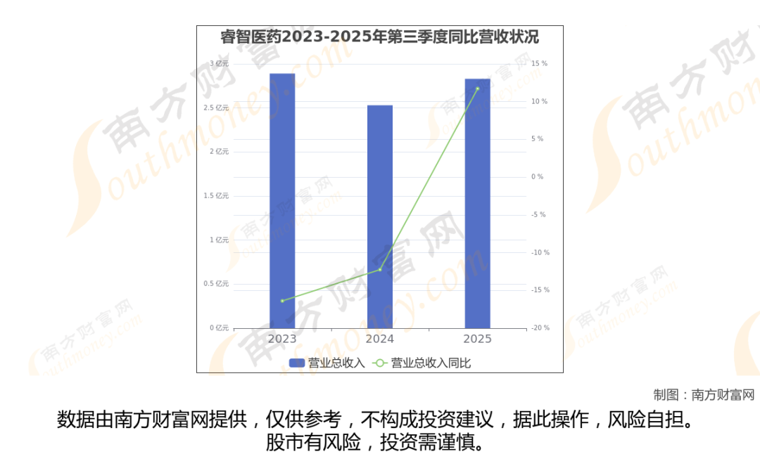 在2025年第三季度,睿智医药的业绩表现(如上图),主营业务收入达到2.83亿元,实现了11.72%的同比增长率。