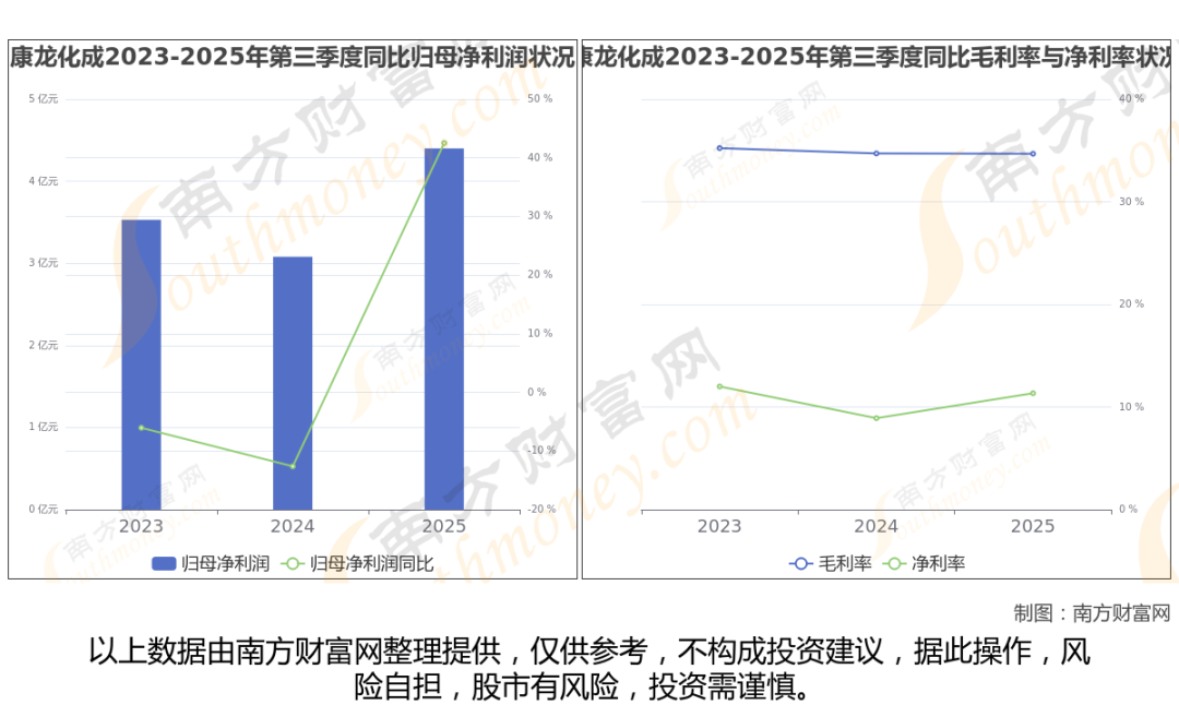 2025年第三季度季报显示,康龙化成公司实现净利润4.4亿,同比增长42.52%;毛利润为12.64亿,毛利率34.68%。