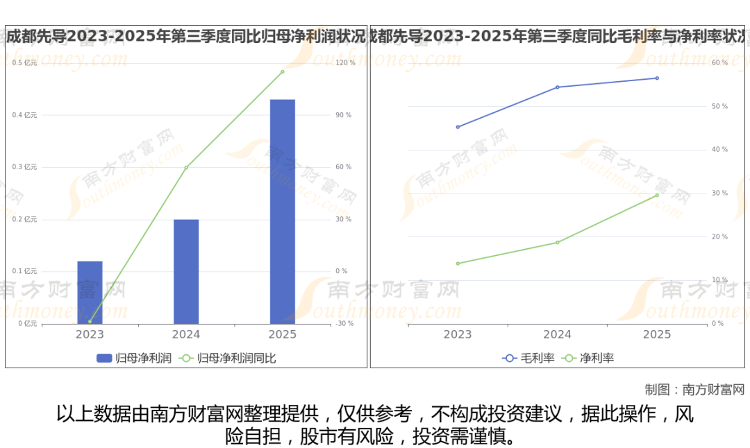 2025年第三季度季报显示,成都先导公司实现净利润4283.02万,同比上年增长率为114.98%,毛利率56.52%,归属净利润4283.02万,同比增长114.98%。