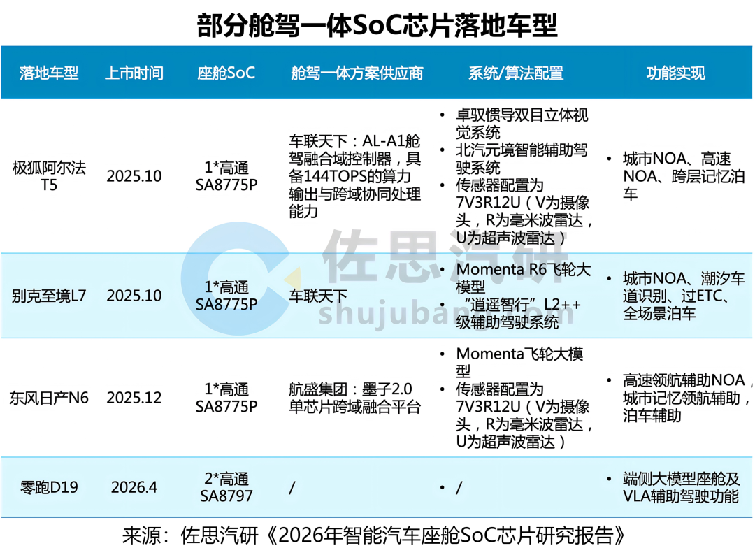 舱驾一体SoC芯片已量产落地。高通SA8775P作为首款量产的单芯片舱驾一体方案,自2025年10月起,已跟随极狐全新阿尔法T5/S5、上汽通用别克至境L7/世家、东风日产N6等车型上市;零跑D19、理想L9(2026款)也已率先搭载高通下一代舱驾一体SoC SA8797芯片,计划今年第二季度正式上市。更多车型的搭载,以及NVIDIA DRIVE Thor系列、瑞萨R-Car X5H等多域融合/舱驾一体SoC的不断推出,标志着座舱SoC向多域融合/舱驾一体SoC迁移。