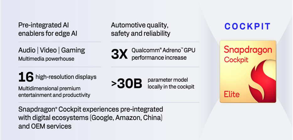 智能座舱正从传统的“功能集合”向“智能伙伴”演进,AI 已不再作为智能座舱中的单一功能模块被呈现,而是逐步演变为组织整套人机交互逻辑的中枢性能力。AI Agent(智能体)作为这一变革的核心载体,通过整合感知、决策、执行与记忆能力,实现了从“被动响应”到“主动服务”的跨越。为支持端侧AI大模型,座舱SoC需要更高NPU算力、更高内存带宽、以及更稳定且持续的发挥。目前,高通新一代座舱SoC SA8397芯片NPU算力高达360 TOPS,速度相比前代提升3倍,存储支持LPDDR5X,内存带宽204.8GB/s,支持本地运行生成式AI模型。