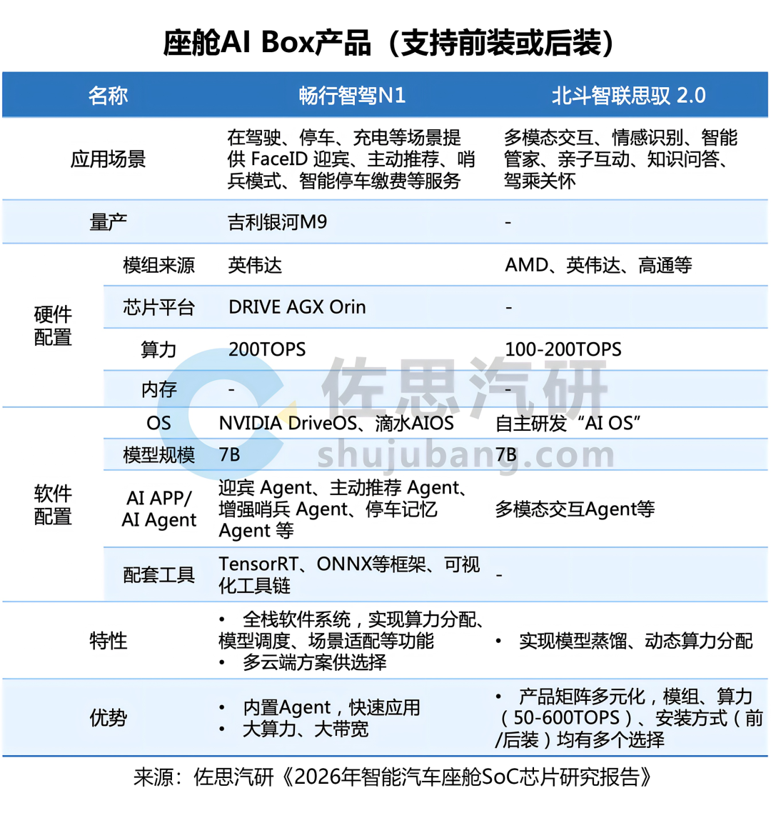 在系统层面,主机厂可通过外置AI Box叠加AI算力,无需重构整车架构即可部署多模态大模型,实现AI能力灵活扩展。AI Box是一种独立的车载AI计算单元,算力上不依赖传统车规芯片的封闭架构,功能上支持直接连接智驾域/座舱域/车联网域的对应系统,实现即插即用。AI Box一般搭载的是高性能、大算力SoC,例如图灵AI芯片、英伟达Thor等,其灵活性受到诸如小鹏、吉利、上汽等车企青睐。