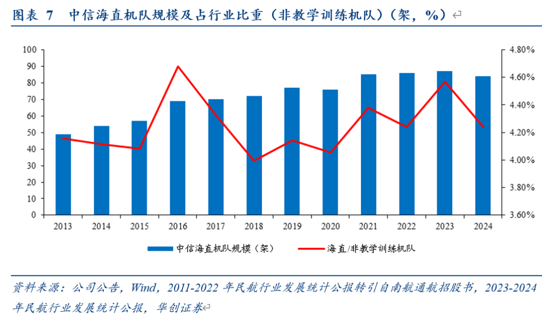 近十年来,公司机队规模占行业在4.2%左右。(2024年我国在册通用航空器3232架,其中教学训练用1252架,非教练用1980架,我们以非教练用机队为基数,但其中还包括小型通用航空器,规模占比仅作参考)。