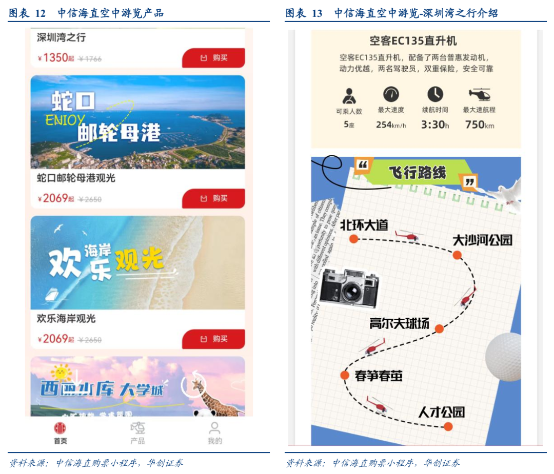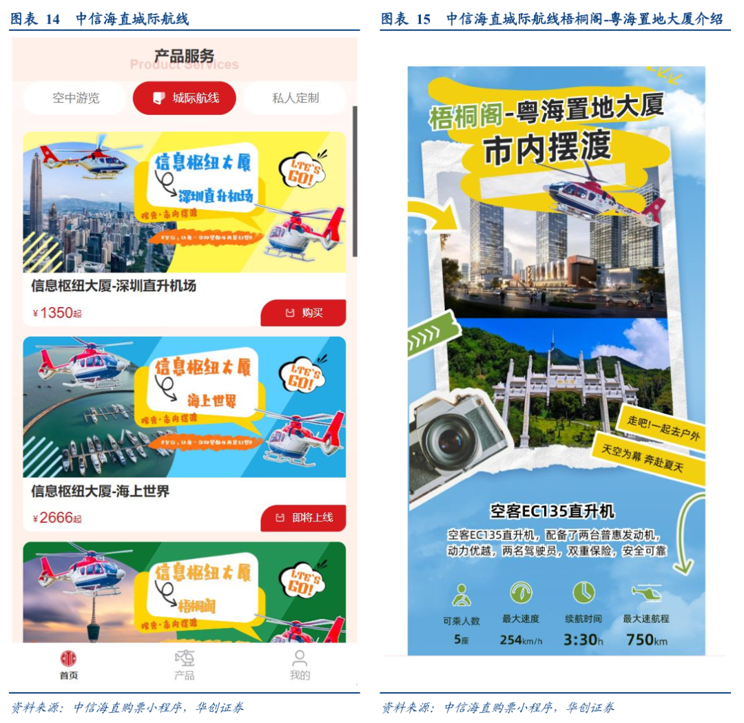 2024年4月30日,中信海直正式开通大湾区低空短途运输航线(深圳南头-珠海九洲),并上线购票小程序,我们查阅发现:包括“空中游览”、“城际航线”、“私人订制”三大产品。