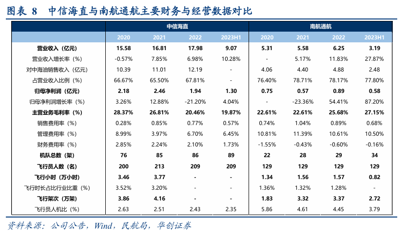 中信海直是目前A股唯一上市的通用航空运营企业,南航通航曾于2023年12月提交招股说明书,2024年7月终止IPO申请。两者与中国通航,是为中海油提升石油飞行业务的仅有的三家服务商。双方可就公开数据做比较(取南航通航招股说明书披露数据与中信海直同期对比)。