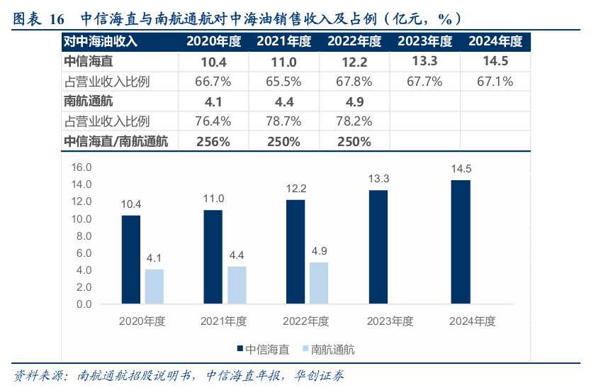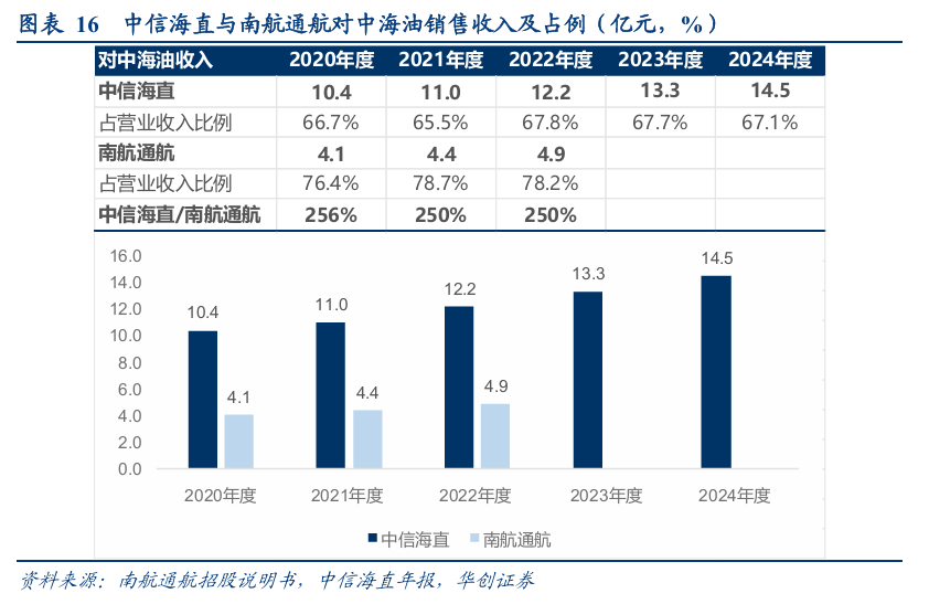 2020-24年,中信海直对中海油销售收入分别 10.4、11.0、12.2、13.3及14.5亿,占收入比重约7成;南航通航2020-2022年间对中海油销售收入分别为4.1、4.4及4.9亿元,占收入比重约8成。中信海直相关收入是南航通航的2.5倍左右。