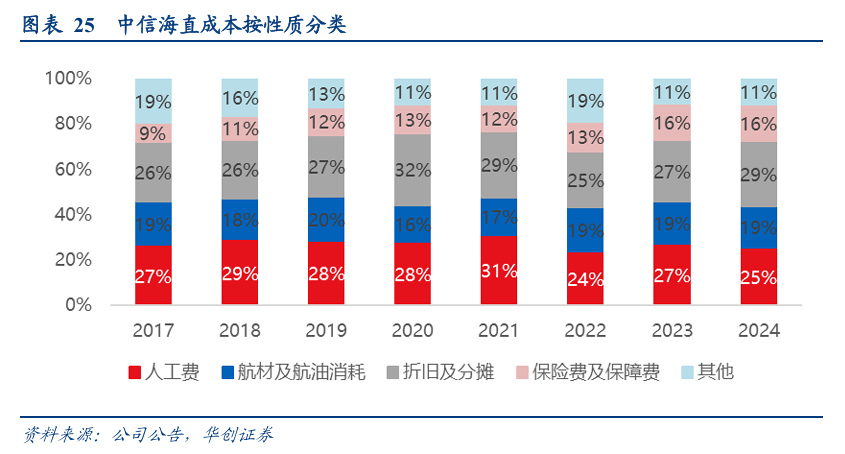 2017-2024年平均值看,人工成本占比27%,航材及航油消耗占比18%,折旧及分摊成本占比27%,保险费及保障费占比13%,其他占比14%。