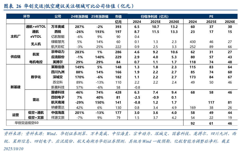 2、估值比较:华创交运|低空60系列建议关注可比公司估值25-26年PE分别为61、46倍。公司估值低于可比公司,强调推荐评级。
