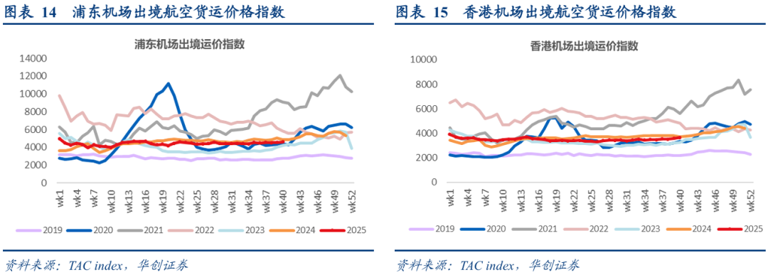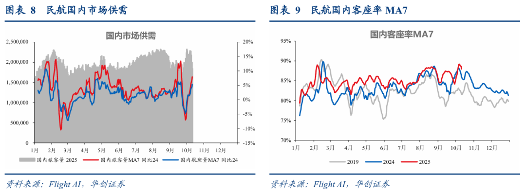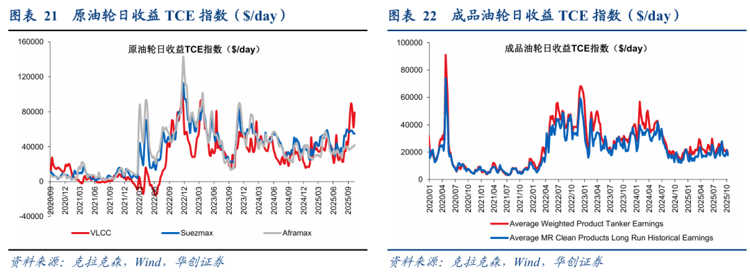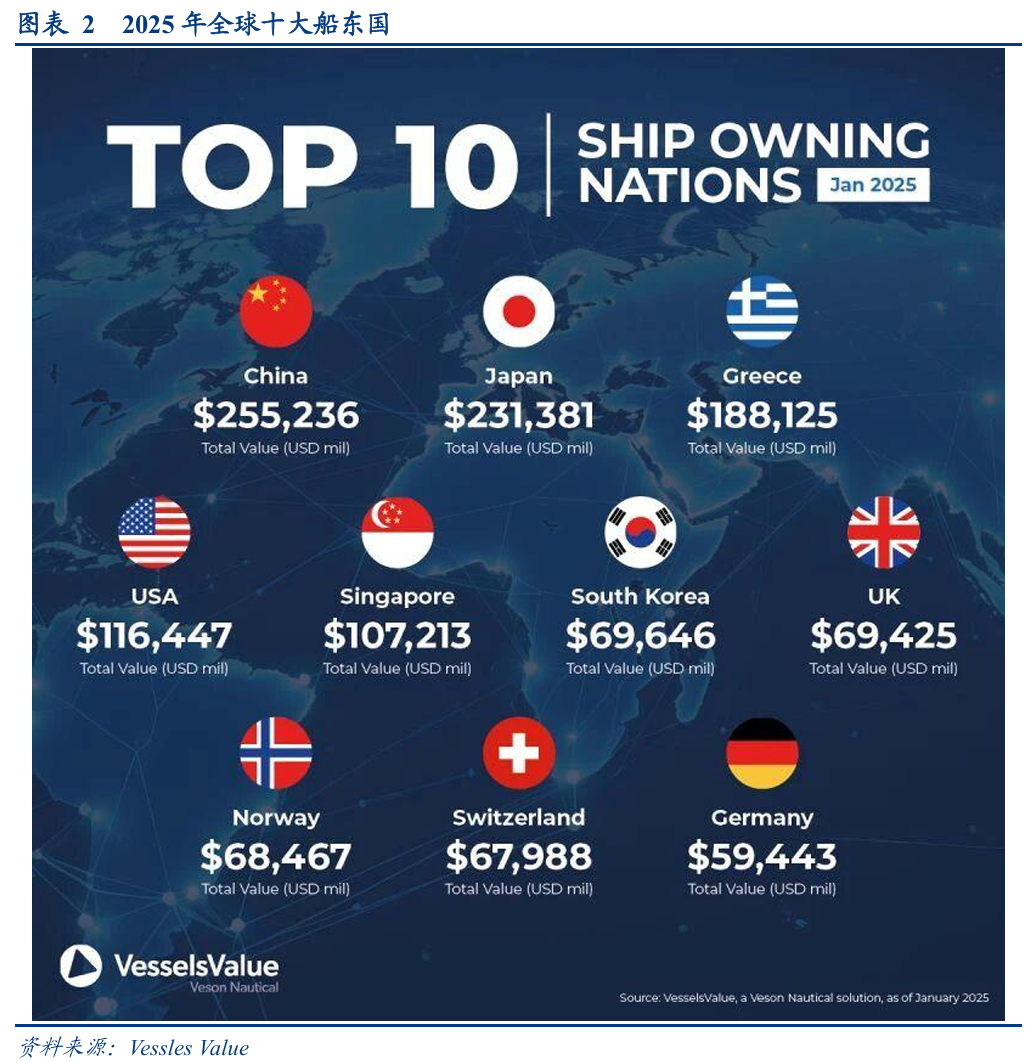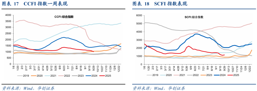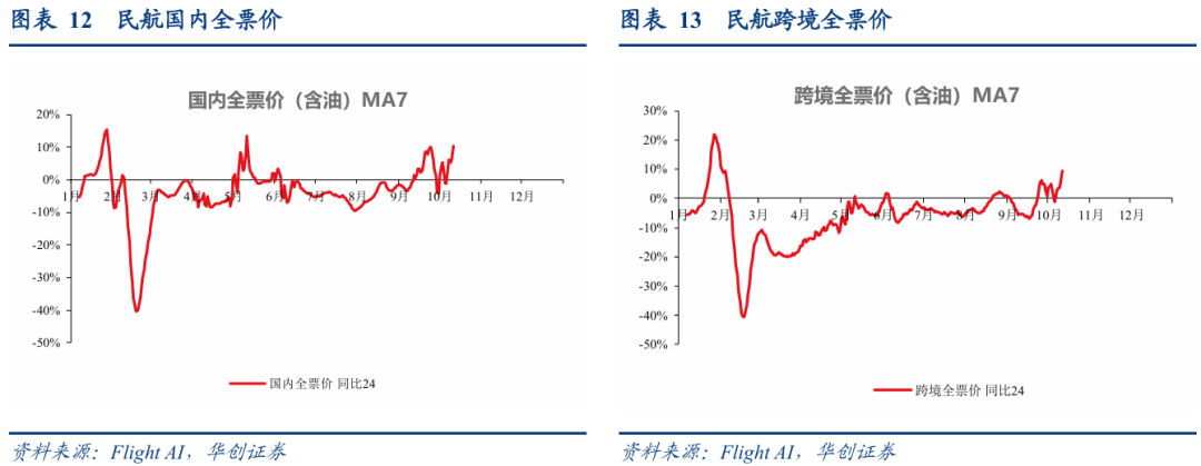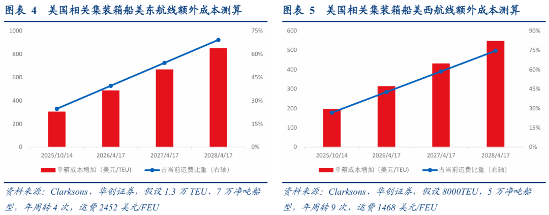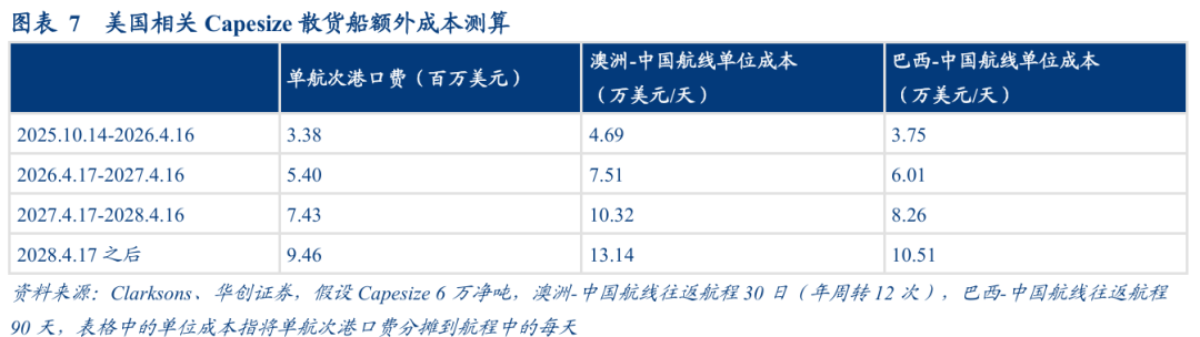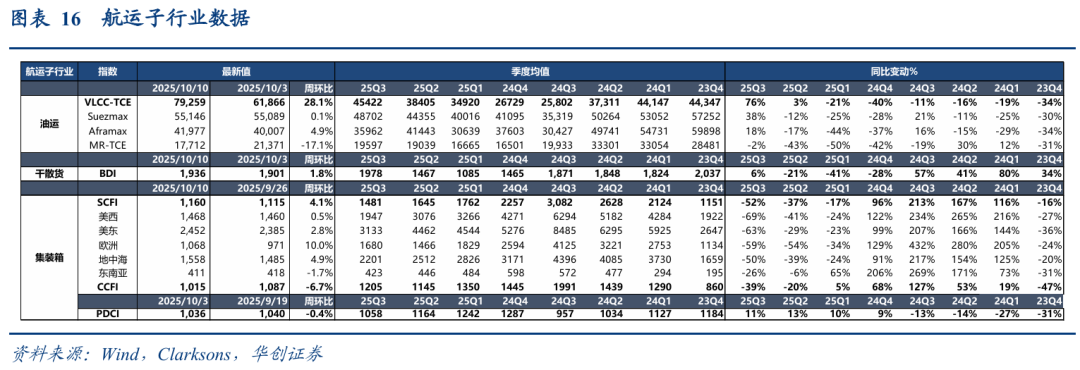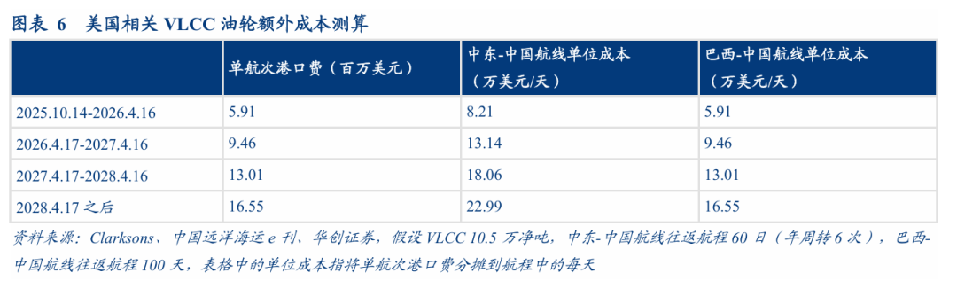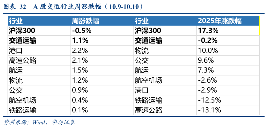 Clarksons统计美国公司拥有、悬挂美国旗及美国建造的油轮、散货船、集装箱船运力占比分别为2.1%、1.4%、0.59%,但考虑到美国资本持股25%以上的措施,可能影响范围更广。根据Vessles Value发布的《2025年全球十大船东国》榜单,排名按受益船东所属国家或地区船队(包括现有船舶与订单船舶)的总资产价值划分,美国名列世界第四大船东。具体来看,油轮船东如DHT Holdings、Torm、Teekay Tankers、International Seaways、Scorpio Tankers等,集装箱船东Zim,散货船东如Star Bulk、太平洋航运等以及美国货主如雪佛龙、美孚等租入船舶,若其涉及中国航线,可能都属于本次我国“特别港务费”的征收范围。1)集装箱船:美东航线,测算四个阶段递增的单箱港口费用在303~849美元/TEU,占当前运费比重25%~69%;美西航线,测算四个阶段递增的单箱港口费用在195~547美元/TEU,占当前运费比重27%~75%。2)VLCC油轮:传统的中东-中国航线,测算四个阶段递增的单位成本在8.21~22.99万美元/天;巴西-中国长航线,测算四个阶段递增的单位成本在5.91~16.55万美元/天,远高于正常的运价水平。3)Capesize散货船:澳洲-中国航线,测算四个阶段递增的单位成本在4.69~13.14万美元/天;巴西-中国航线,测算四个阶段递增的单位成本在3.75~10.51万美元/天,远高于正常的运价水平。总结来看,中美双方互征港口费措施将带来船司成本端的增加,同时措施落地窗口短会打乱既定的交易节奏及方案,造成短期的混乱局面,贸易摩擦加剧的背景下,船司具有更强的成本转嫁动机以及更强话语权,支撑短期运价上涨。中长期来看,船司可以通过全球不同航线之间的运力调配规避港口费用的征收,但考虑到中国在全球干散货、能源运输及制造业出口板块极其重要的位置,最终的影响效果需要继续观察;此外,航运网络从效率最优到纳入地缘因素的最优,势必会带来效率损失。1、航空客运:近7日民航国内旅客量同比 7.9%,平均含油票价同比 6.7%;2、航空货运:10月6日浦东机场出境货运价格指数周环比 1.3%,同比-5.3%;3、航运:VLCC运价环比 28%,BDI环比 2%,SCFI环比 4%。三、市场回顾:本周交运板块上涨1.1%,跑赢沪深300指数1.6pct。四、投资建议:强调看好景气方向,关注超跌后的“红利”价值。