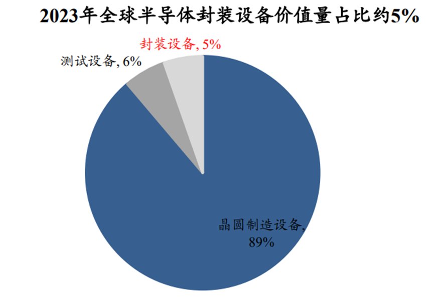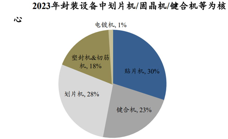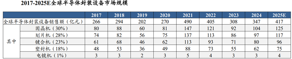 2023年后道封装设备占半导体设备的价值量比重约5%,固晶机/划片机/键合机等为核心设备。根据SEMI预测,2025年全球半导体封装设备市场规模有望达417亿元,其中固晶机(贴片机)占比30%,划片机(切片机)占比28%,键合机占比23%。
