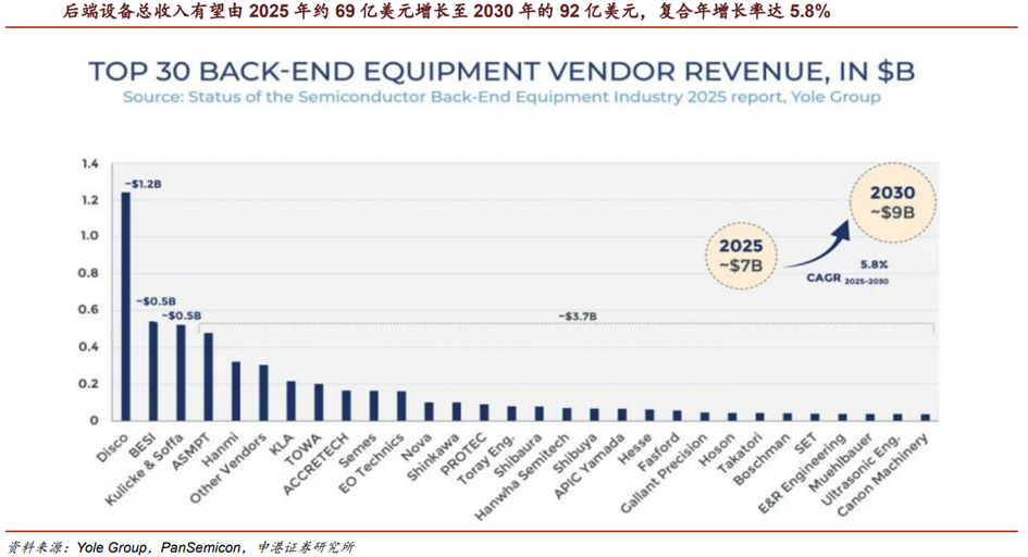 我国半导体设备国产化率相对偏低,根据EEPW,2024年除去胶设备、清洗设备、刻蚀设备和热处理设备国产化率超30%外,PVD/CVD/ALD、CMP、涂胶显影、离子注入、量检测和光刻等环节的国产化率仍低于20%,分别为5-20%、30-40%、5-10%、10-20%、1-10%和0-1%。过去国内半导体设备国产化的主要方向聚焦于晶圆制造领域,目前先进封装等后端设备在芯片制造中扮演的角色日益重要,根据相关数据,2025年后端设备总收入约为69亿美元,预计到2030年将增长至92亿美元,复合年增长率为5.8%,目前国内供应商仅满足不到14%的内部后端设备需求。