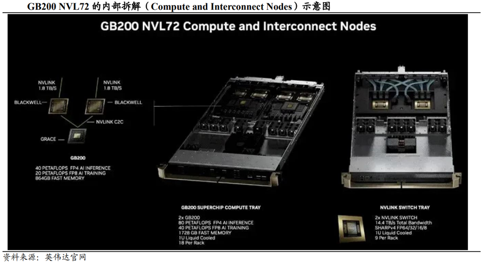 AI大模型参数规模的快速增长,带来超大计算能力和内存资源需求,超节点技术孕育而生。以英伟达基于NVLink的NVL72方案为例,整个系统由18个Compute Tray和9个Switch Tray构成,其中1个Compute Tray包含2个GB200超级芯片(Superchip),每个GB200超级芯片有2个Blackwell系列的B200GPU;1个Switch Tray包含2颗NVLINK Switch芯片,整个机柜后部通过线缆将Compute Tray和Switch Tray进行互联。