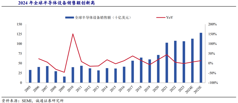全球半导体设备销售额呈现周期性波动。根据SEMI数据,2019-2021年为全球半导体设备市场的高速增长期,2020/2021年同比增长19.1%/44.1%;2022年同比增长4.9%,增速放缓,创下年度最高销售额1,076亿美元;2023年销售额同比下滑1.2%至1,063亿美元。SEMI预测,2024年全球市场恢复增长趋势,全年销售额再创新高,达到1,130亿美元(yoy 6.5%);2025年增速进一步提升,全年销售额有望达到1280亿美元。