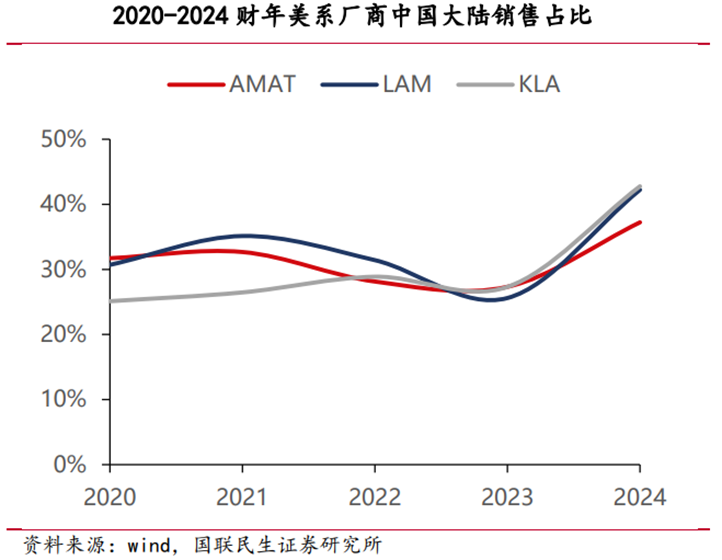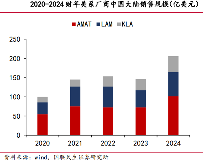 美系设备厂商收入成长严重依赖中国大陆市场。2020年至今,美系半导体设备厂商对中国大陆的销售规模持续提升。2024财年AMAT、LAM、KLA对中国大陆的销售规模分别为101.17、62.94、41.97亿美元,占比分别达到37%、42%、43%。从替代规模来看,2024财年三大美系厂商在中国大陆销售规模超过200亿美元,国产半导体设备的成长空间较为广阔;从替代可能性来看,国产设备已具备成熟制程大部分环节的国产替代,并有望加速先进制程替代。