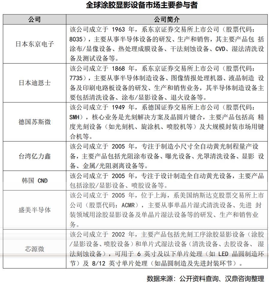 当前,涂胶显影设备行业集中度较高,全球涂胶显影设备主要制造商包括日本东京电子(TEL)、日本迪恩士(DNS)、德国苏斯微(SUSS)、中国台湾亿力鑫(ELS)、韩国CND等。