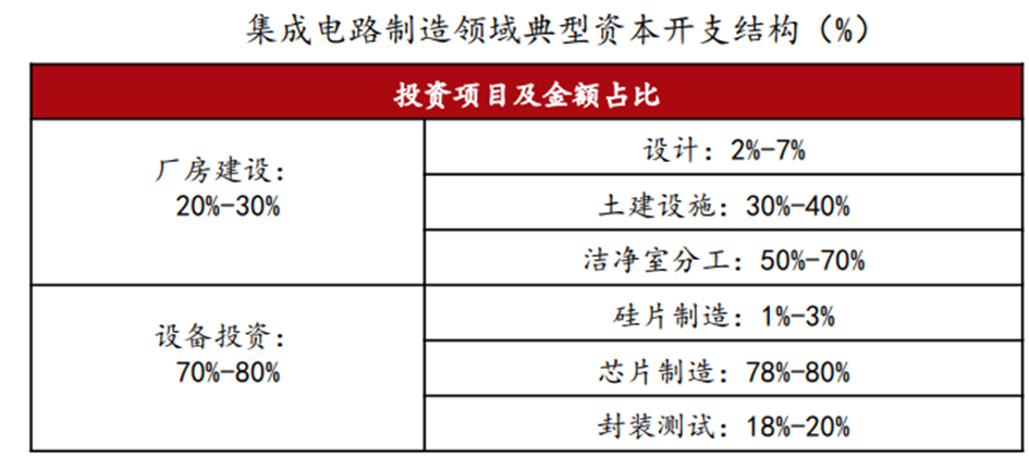 根据Gartner数据,集成电路制造设备投资一般占集成电路制造领域资本性支出的70%-80%,且随着工艺制程的提升,设备投资占比也将相应提高——当制程达到14/16nm时,设备投资占比可达85%。